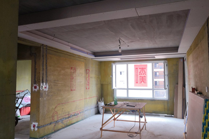 木工正在進行,石膏線和木質輕鋼龍骨搭配,打造質量為王的吊頂