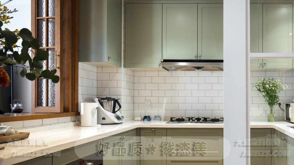 當陽光透過窗戶,灑在綠色的墻面上,與木色的櫥柜和白色的瓷磚相映成趣,整個廚房就如一個生機勃勃的小森林,讓烹飪變得更加愉悅和有趣。