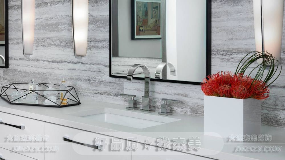 大面鏡擴(kuò)大空間感,帶來(lái)明亮照明效果。金屬質(zhì)感水龍頭與自然紋理灰色石材洗面盆契合簡(jiǎn)約風(fēng)格。
