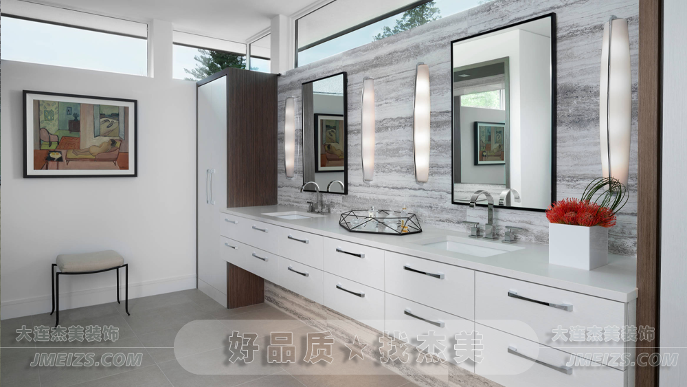 白色石材地磚與洗面臺(tái)形成統(tǒng)一視覺(jué),極簡(jiǎn)風(fēng)格突顯空間本身線條之美。并配以深色實(shí)木柜臺(tái),豐富層次。