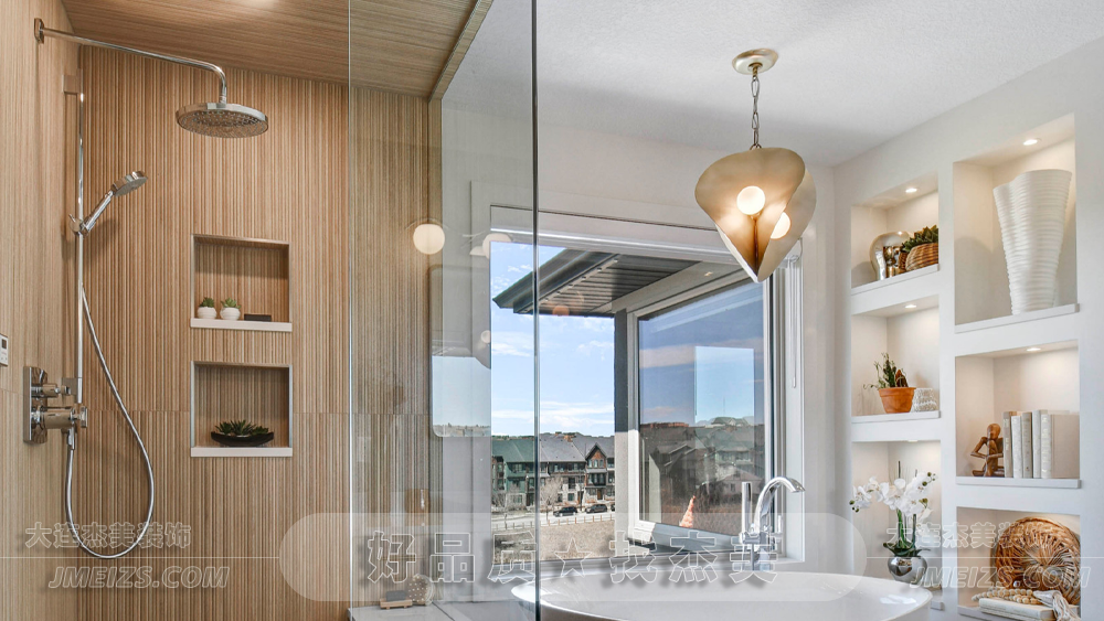 枝形吊燈散發(fā)溫暖光線,裝飾畫與骨朵組合編碼海洋生機,巧妙點綴這個充滿自然氣息的泳池浴室。