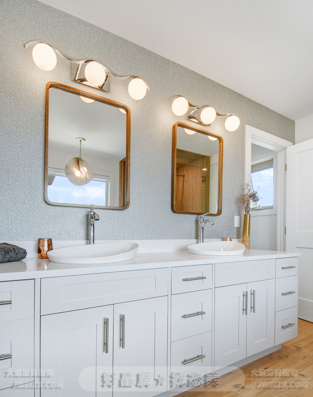 清新雅致的海濱風格浴室,設計師巧妙運用自然元素,營造出一派海天連成的悠閑氛圍。
