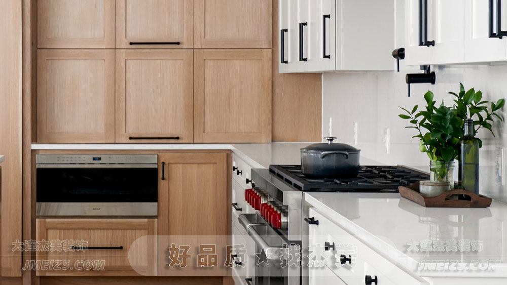 廚房主體采用了白色和原木色調,與金屬質感的廚具形成了和諧的統一。原木櫥柜與淺色的臺面形成了鮮明的對比,既展現了簡約的美感,又不失高貴的氣息。金屬與木材的結合,更是為這個空間增添了一絲溫馨與奢華。