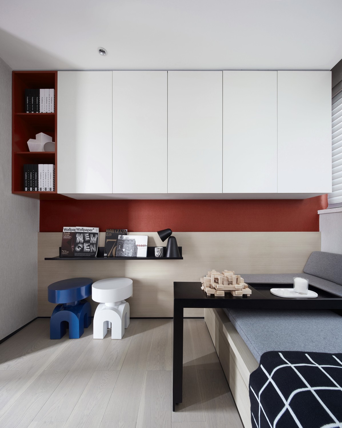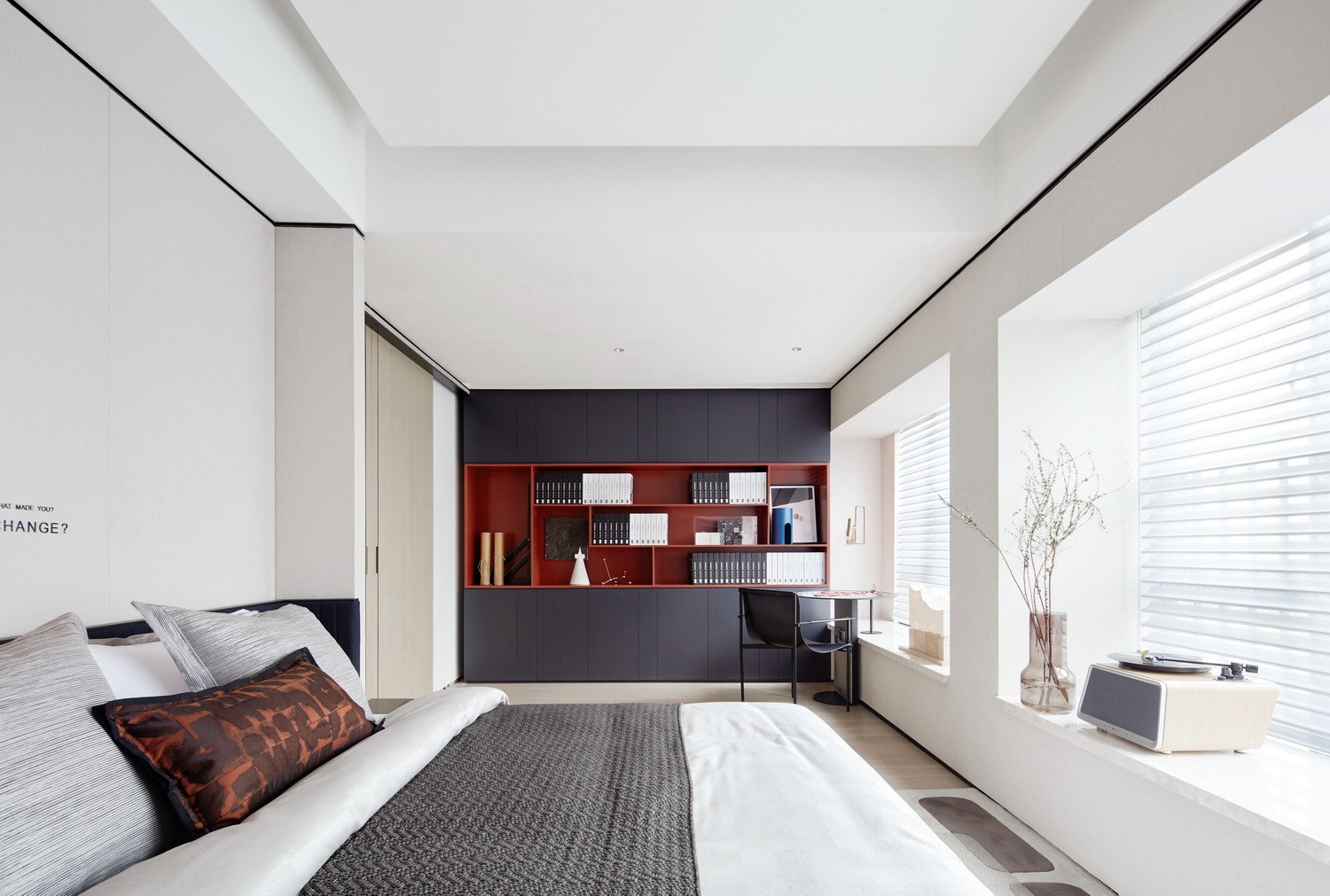 走進臥室,仿佛踏入一方寧靜素雅的天地。與外面的多彩形成鮮明對比,這里以純凈的白色為主調(diào),營造出一種平和安寧的氛圍。紅黑底色的書柜和書桌,為這份素雅增添了一抹沉穩(wěn)與個性。窗戶是臥