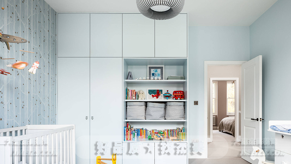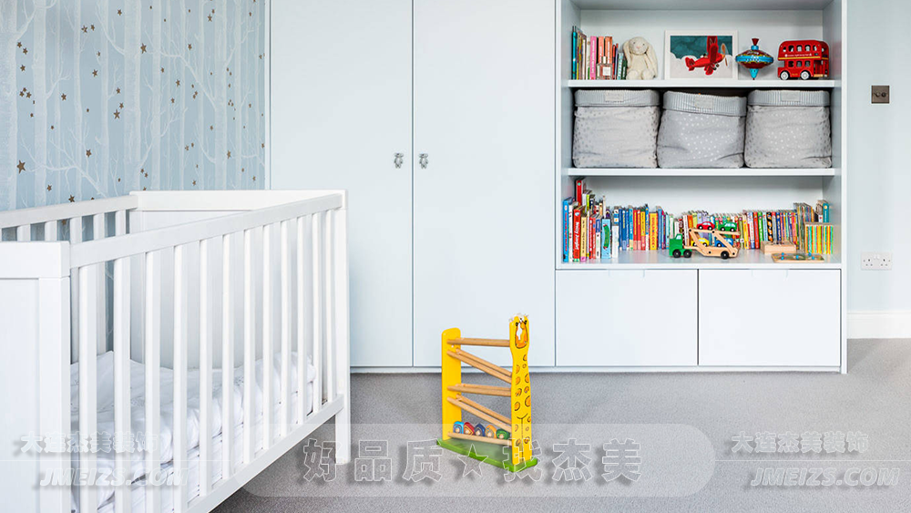 室內的色彩以柔和的天空藍為主,給人一種如同漫步云端的輕松感。墻上淡雅的星球圖案壁紙,仿佛打開了一扇窗,引領著孩子們的想象力穿越銀河,探索星際的奧秘。這樣的設計不僅僅是視覺上的美悅,更是對孩子內心世界的溫柔呼應。